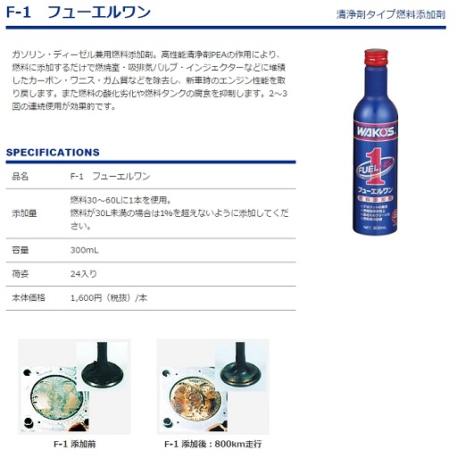 [amazonjs asin=”B0025R9HKU” locale=”JP” title=”ワコーズ F-1 フューエルワン 洗浄系燃料添加剤 F112 300ml F112 HTRC3″]