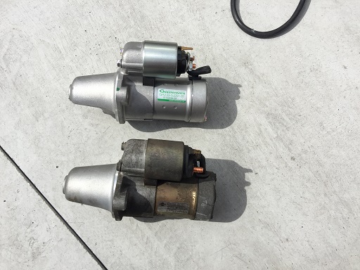 取り外したセルモーターとリビルトのセルモーターを並べて固定位置が同じとかなどを確認し、ブースターパックを用いて電気を流しセルモーターの電流値を測定し、リビルトのセルモーターが正常ならばリビルトのセルモーターの取付にかかります。