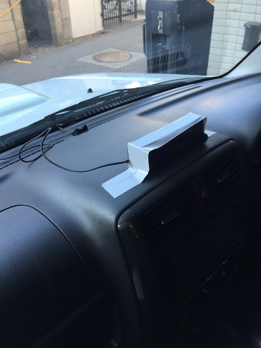 無線機のコントロールパネルは液晶の見やすく、お客様の使い勝手の良いように決めてもらうためにダッシュボードに仮固定しておきます。