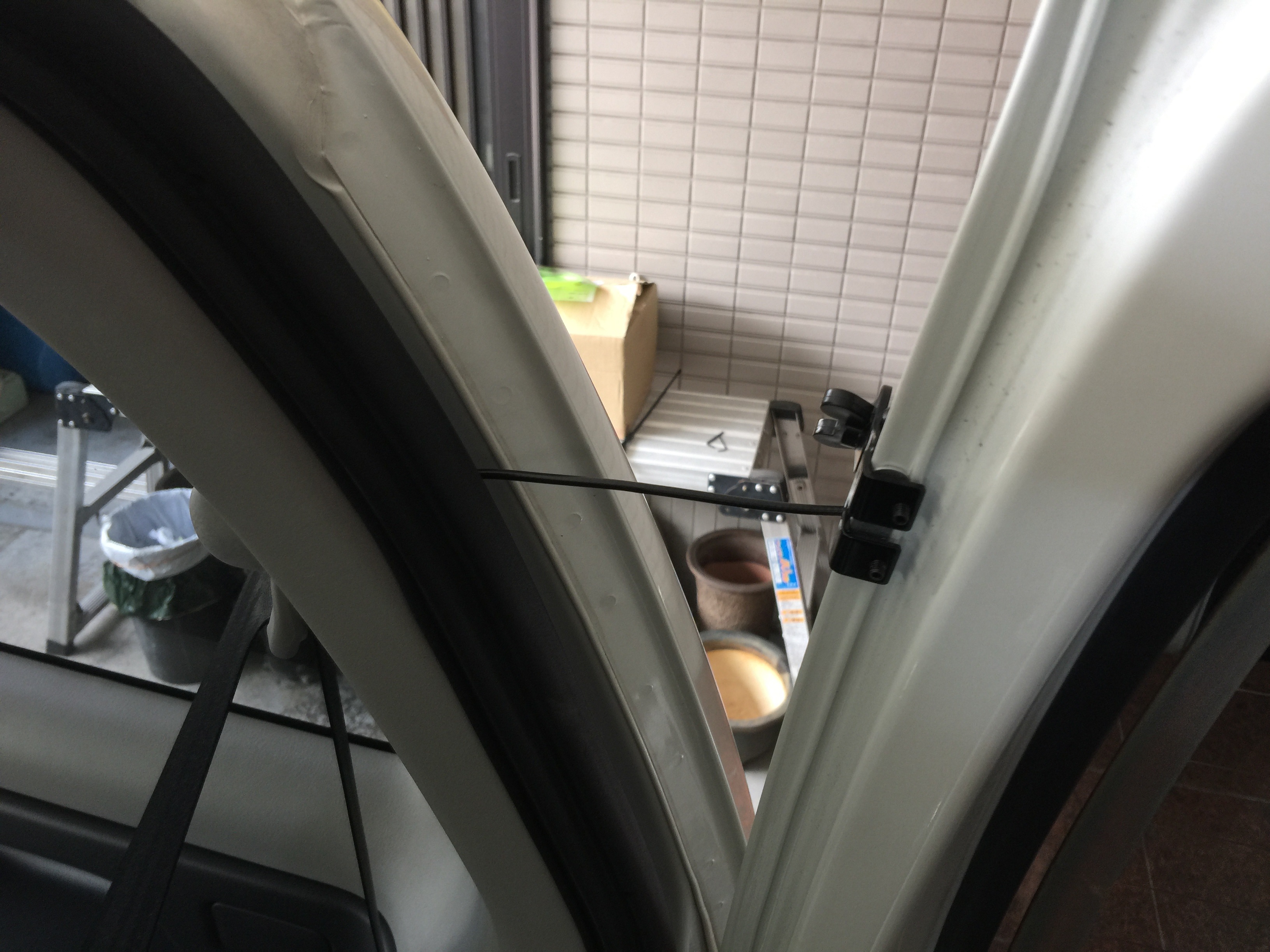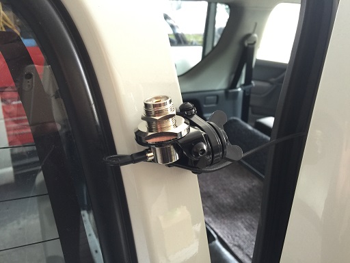 リヤゲートにアンテナの固定台を取り付け、リヤゲートとボディー間のアンテナ線はドアの開閉分の余裕を見てここまでは固定していきます。